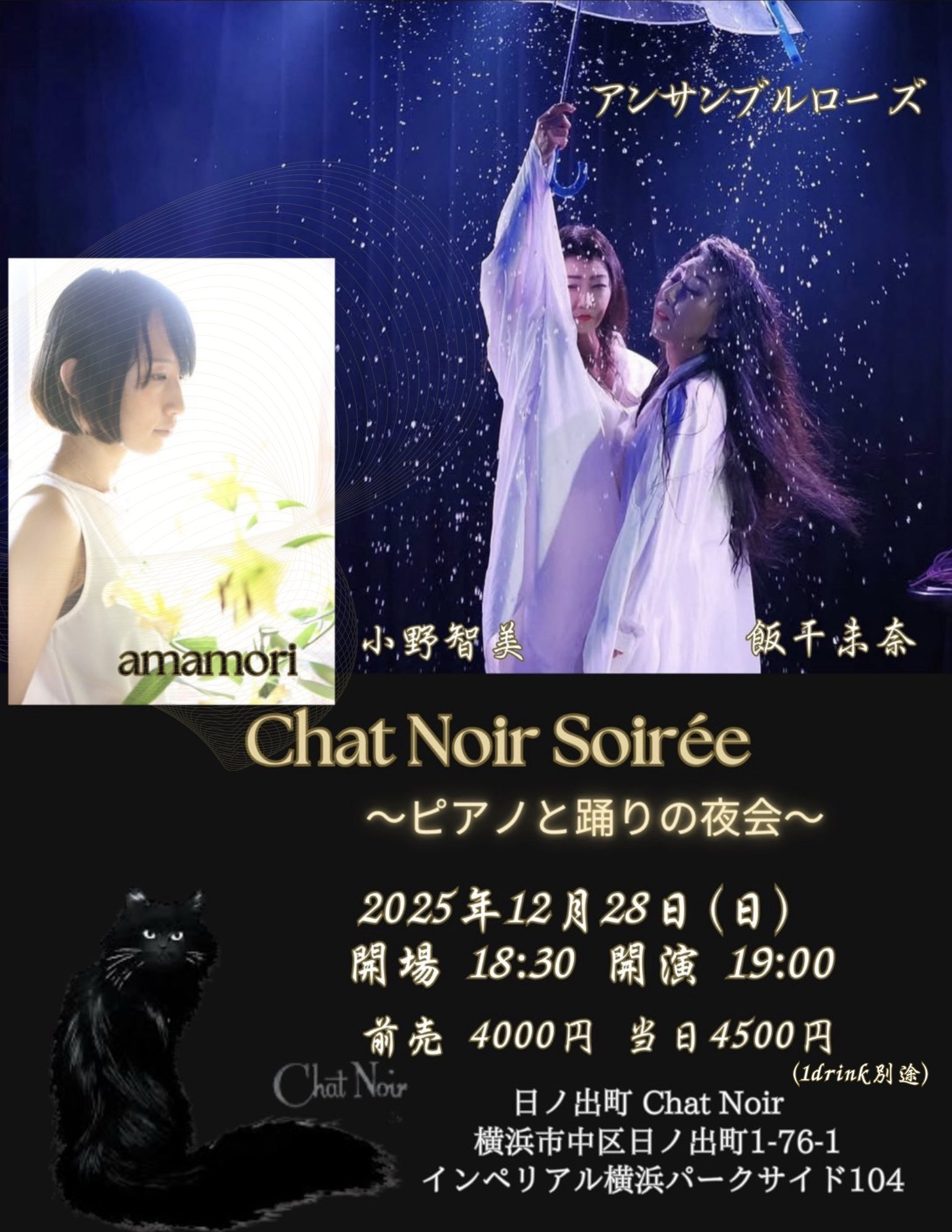 日ノ出町 Chat Noir open18:30/start19:00 前¥3000/当¥3500 +1drink 出演 amamori、小野智美、飯干未奈 舞踊の飯干未奈さんにお声がけいただきまして今年最後にこちら、ピアノ弾き語りで出演します! アンサンブルローズのおふたりの踊りとのコラボもあるかも? 来場予約